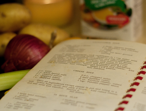 I have several old cookbooks that the ladies of my church published many, many years ago. I still go back to them for those tried and true recipes that I remember savoring at potluck dinners. This recipe is for Cheese Soup and is one my family’s favorite. It’s from one of the best cooks at our church who happens to be one of my best friends. Whenever I have a question about recipes, kids, or life in general, I can always call her and get sound advice or just a listening ear.