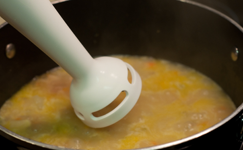 One of my most favorite mini appliances is this immersion blender. After the potatoes were soft, I placed the hand blender in the pot of soup and pureed away – but not too much. You want to eave some chunks of potato. This makes the soup a little thicker which my family likes. If you don’t have an immersion blender, you can leave this part out and the soup is still yummy!