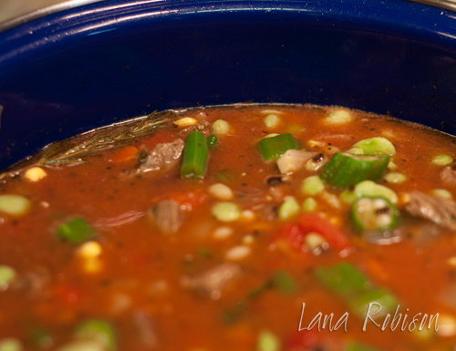 I love the color in this soup! All those bright green pieces of okra and green beans, golden corn, red tomatoes…YUM!