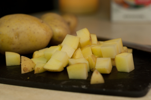 I cut the potatoes into small pieces so they would cook faster. These were pretty Yukon gold potatoes so I left the skin on for more nutritional value.