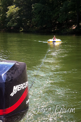 This was the first lake outing of the year for my 7 year old granddaughter. She just had to get in the boat and tube. So we packed peanut butter and jelly sandwiches and met “Poppa” at the dock. We found a quite little cove–perfect for eating lunch and learning to tube alone.