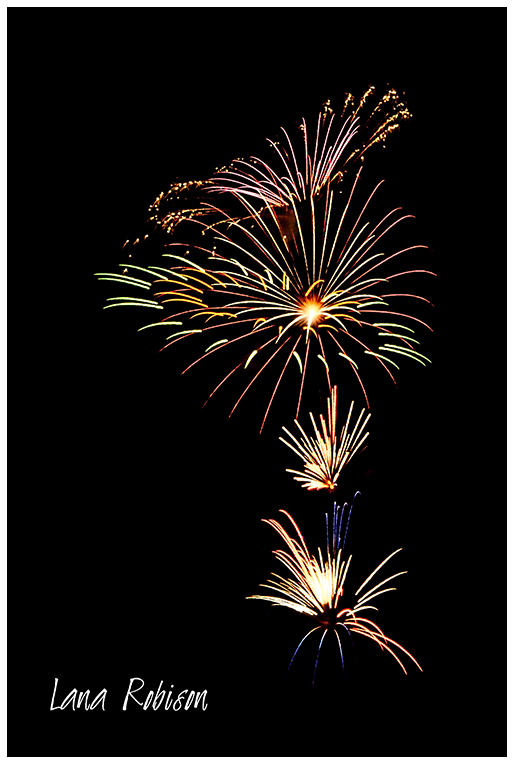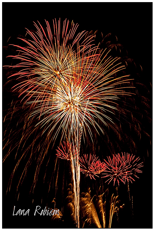 I absolutely l-o-v-e fireworks…the bright colors against a dark background, the surprise of the shape when it explodes, the oohs and aahs, even the loud booms. This year I was able to get to see two firework events and would have tried for more if I could. I am amazed at how they can pack the shells in such a way that when they explode they make a specific design. A couple of years ago I saw fireworks that exploded into a smiley face!