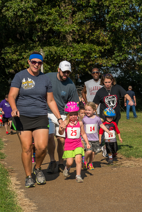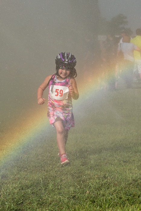 Since these are little ones, their swim part of the course was running through the biggest sprinkler I’ve ever seen! Before the race I spoke with a dad of a 2 year old who was new to the event to be prepared to get wet when it came time for his child to run through the sprinklers. He assured me that his little one loved sprinklers. I assured him this was no ordinary sprinkler! You see, one end of a fire hose is attached to pcv pipes with small holes drilled in them. It runs down both sides of the entire length of the “swim” course. The other end of the fire hose is attached to a fire hydrant! There’s so much water spraying out that it produces a big, beautiful rainbow at the end of the course! Did the dad get wet? Yes, yes he did! And so did a lot of other parents.